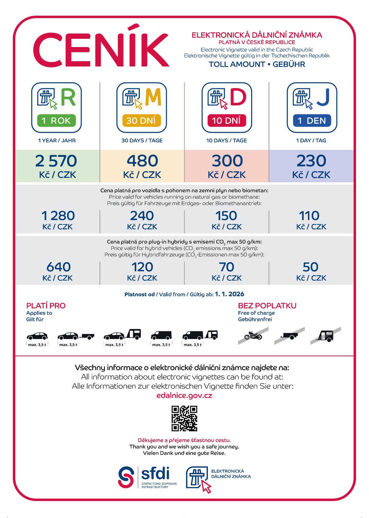 Od januára 2026 sa v Českej republike zvýši cena elektronických diaľničných známok v dôsledku medziročného prírastku dĺžky diaľničnej siete a rastu spotrebiteľských cien. Ročný poplatok za používanie diaľnic vzrastie o 130 korún (5,33 eura) na 2 570 korún (105,45 eura), mesačná známka bude stáť 480 korún (19,70 eura), desaťdňová 300 korún (12,31 eura) a jednodňová 230 korún (9,44 eura).