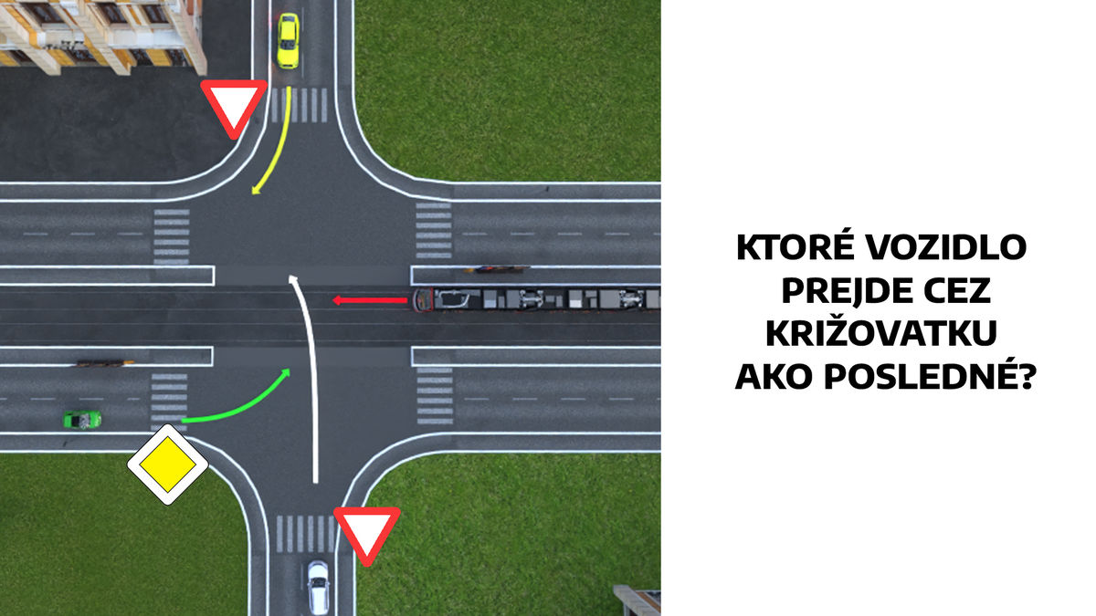 Biele auto – je na vedľajšej ceste oproti žltému, chce odbočiť doľava, a tým kríži hlavnú cestu, po ktorej idú električka aj zelené vozidlo.
